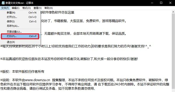 连接完成之后,我们打开记事本,随便输入一些文字来测试打印,输入好之后选择菜单栏上的文件选项,再选择下拉列表中的打印选项。