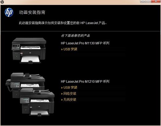 1、首先在go9go手游网下载惠普m1136打印机驱动并解压,然后双击LJM1130_M1210_MFP_Full_Solution.exe安装程序,进入动画安装指南界面后,点击“USB安装”按钮。