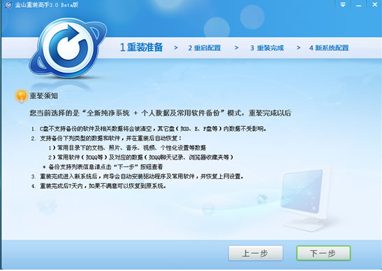3、若选择备份模式,可以快速备份QQ、MSN、旺旺等聊天记录,我的文档、桌面、IE收藏夹、邮件等重要个人数据,确保永不丢失,重装完成后可进行还原。 对于不支持备份的项目,自行备份数据。
