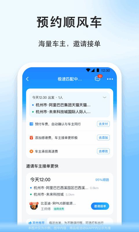 智能匹配:通过算法优化,顺风车app可以智能匹配乘客和司机的行程,减少等待时间,提高出行效率。