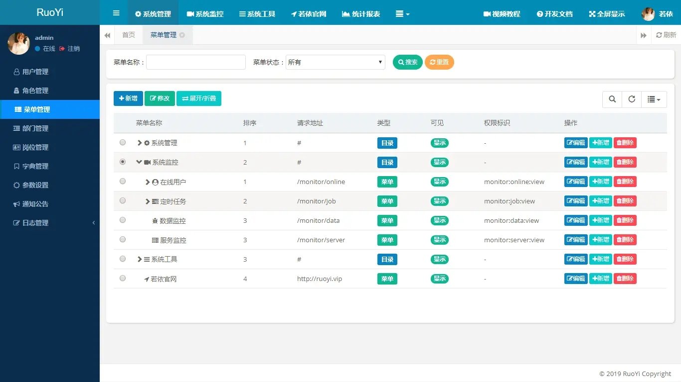菜单管理:配置系统菜单,操作权限,按钮权限标识等。
