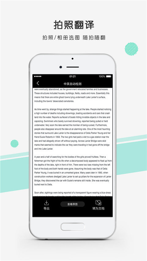 点击首页右下角的“文档”按钮,上传手机中的你所需要翻译的文档(PDF / docx / doc / PPT / xls 任一格式),选定语种,即可获得双语对照的翻译结果!使用同一账号登录,在电脑和手机上均可浏览和下载