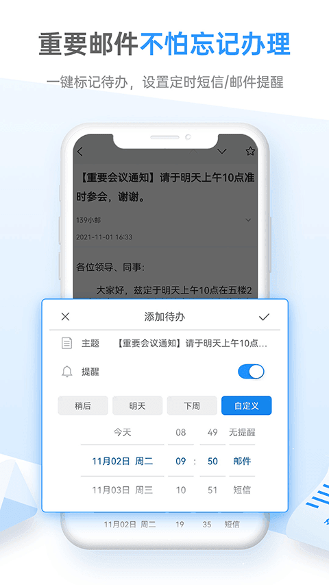 高效:全面整合多邮箱账户管理、附件管理、日历、待办任务和网盘服务,重新定义移动化办公的内涵;