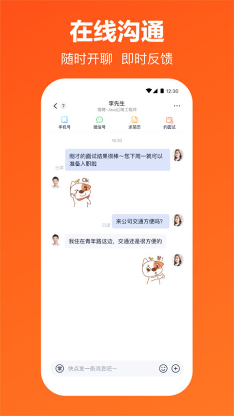 多种沟通方式:候选人支持在线沟通,包括文字、语音和视频三种方式,方便招聘方与求职者进行实时、高效的交流。