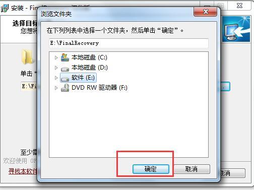 3、接下来就为finalrecovery软件选择目标位置了,默认软件安装在C盘,我们尽量选择自定义安装,单击“浏览”按钮选择一个非系统盘的文件夹然后点击确定。如下图所示: