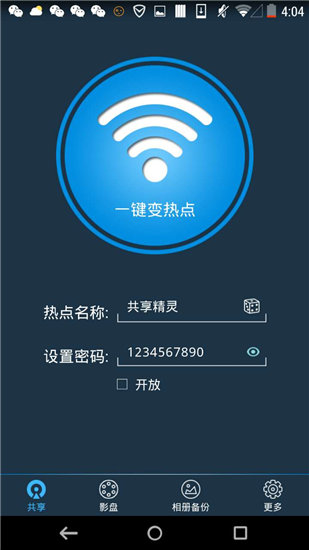 只要手机下载WiFi共享精灵app,就可以一键开启便携式WiFi热点,手机立刻就变成3G路由器,并共享出2G/3G/4G流量给其他设备使用。