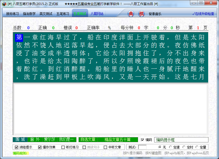 3、文章测试:词组动态提示,见词打词,不成词组才打单个汉字,实时编码帮助,并提供三种测试方式:定速测试、定时测试、定量测试。特别是测试时提供爆炸动画和声音,让枯燥的文章测试也一样充满乐趣(每打对一个字或词,该字或词就会被炸掉)。