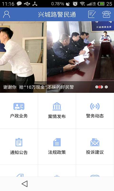 包括警事要闻,办事指南,联系方式,车管助手,交通执法,出入境业务,户政业务,治安业务,技防业务,安全知识,警民互动等功能模块