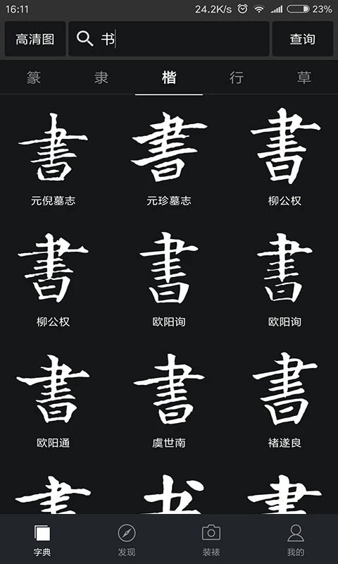 2、书法字典:三十万书历代名家书法字,包含五种字体:篆书、隶书、楷书、行书、草书等。