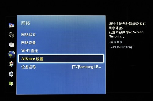 F8000遥控器运用触控与按键相结合的设计,划动操作极为灵敏,使用体验流畅,能让人切实体会到通常只有高端智能电视产品才具备的舒适使用感受。当我们在菜单里依次选择项目——网络——Allshare设置——Screen Mirroring后,就会看到电视屏幕提示连接已准备就绪,接着开启设备上的Allshare Cast功能。