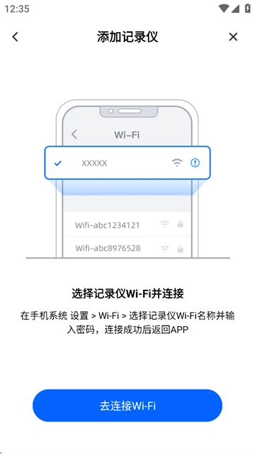 请按以下步骤操作:进入手机系统设置,点击“Wi-Fi”,从中选择记录仪的Wi-Fi名称,并输入相应密码。连接成功后,返回APP 。