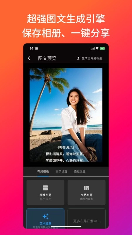 自由调节背景、文字、边框样式,支持自定义字体与排版比例。生成内容可高清保存至相册或直接分享至微信、微博,提升文化格调。