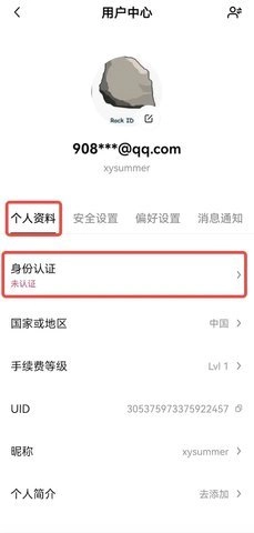 点击【个资料和设置】——【个人资料】——【身份认证】,进入身份认证页面。
