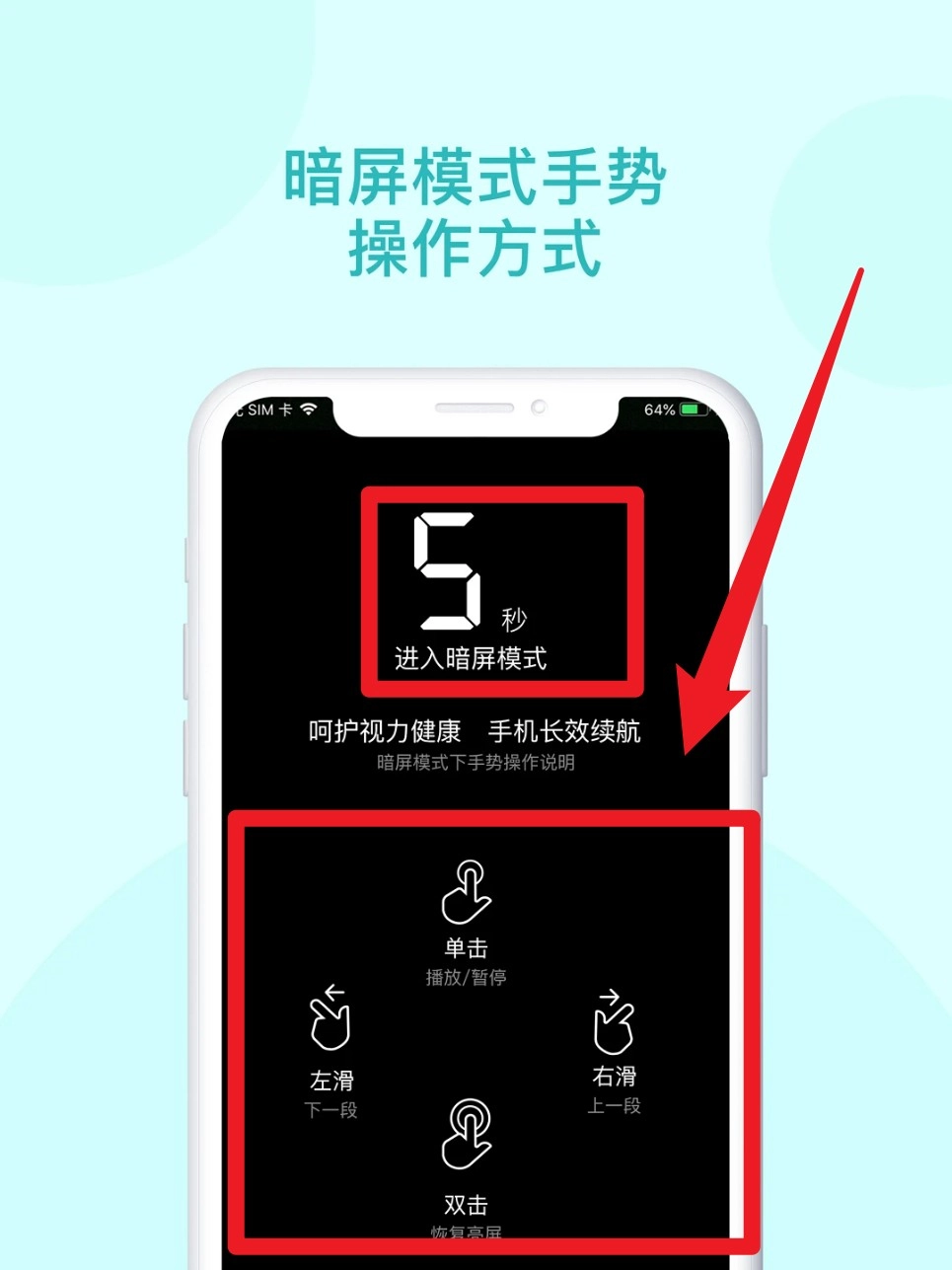 4. 当进入暗屏模式时,能够利用手势操作来控制音频,例如单击实现暂停功能、滑动实现切段功能等。