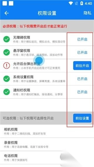 1. 权限开启流程:打开连点器应用,依据提示开启悬浮窗、无障碍等必需权限。由于手机型号不同,开启路径也有所差异,例如可在设置中的“无障碍”位置进行开启。