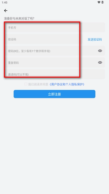 2、在注册页面,输入您的手机号码以获取验证码,设置密码(无需填写邀请码),并同意相关协议后,点击“立即注册”以完成账号创建。