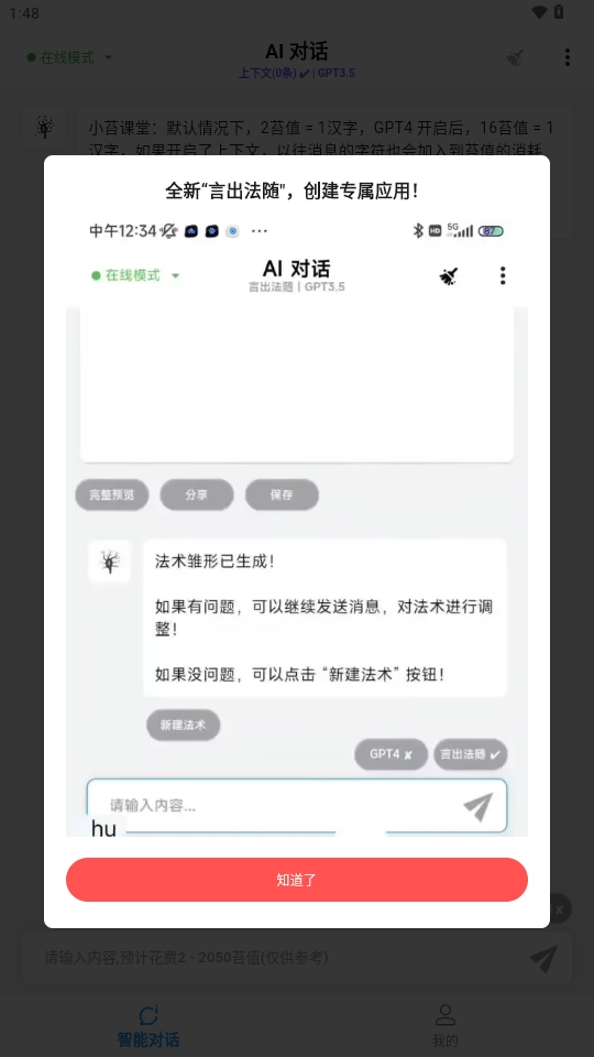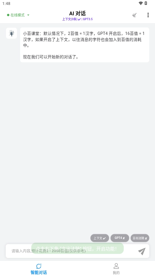 小苔课堂:默认情况下,2苔值=1汉字,GPT4 开启后,16苔值=1汉字如果开启了上下文,以往消息的字符也会加入到苔值的消耗中。