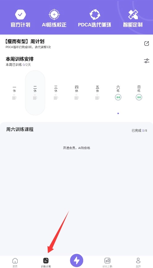 2、浏览本周定制训练课程,可升级VIP享受智能训练指导服务,获取专业动作建议。