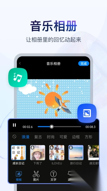 提供多种风格的音乐相册模板,包括浪漫、复古、时尚、可爱、边框、方形,只需勾选图片即可生成热门卡点音乐视频,还支持添加文字、滤镜、修改音乐等。