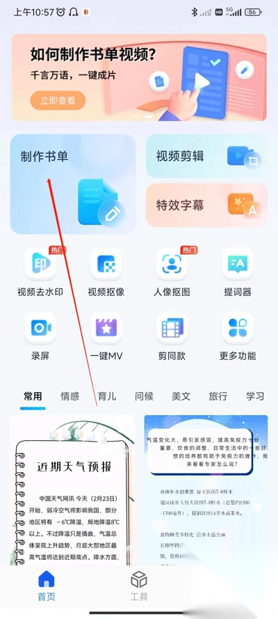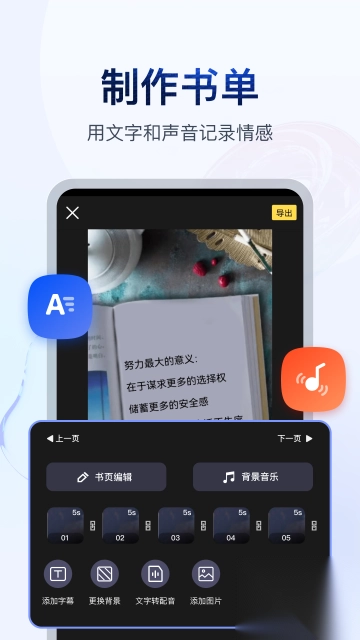 随心创作书单视频,软件内各类模板任您取用,能依据个人喜好自由设定文字动画、气泡等元素;支持添加翻页动效,助力您剪辑出逼真的视频。此外,还能实现实时文字转语音,快速打造有声读物。