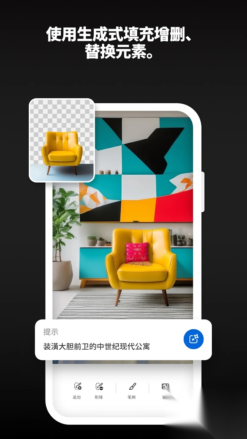 从图像中移除:精准地从照片中删除不需要的物体或人物,并智能地填充背景,使图像看起来自然完整。