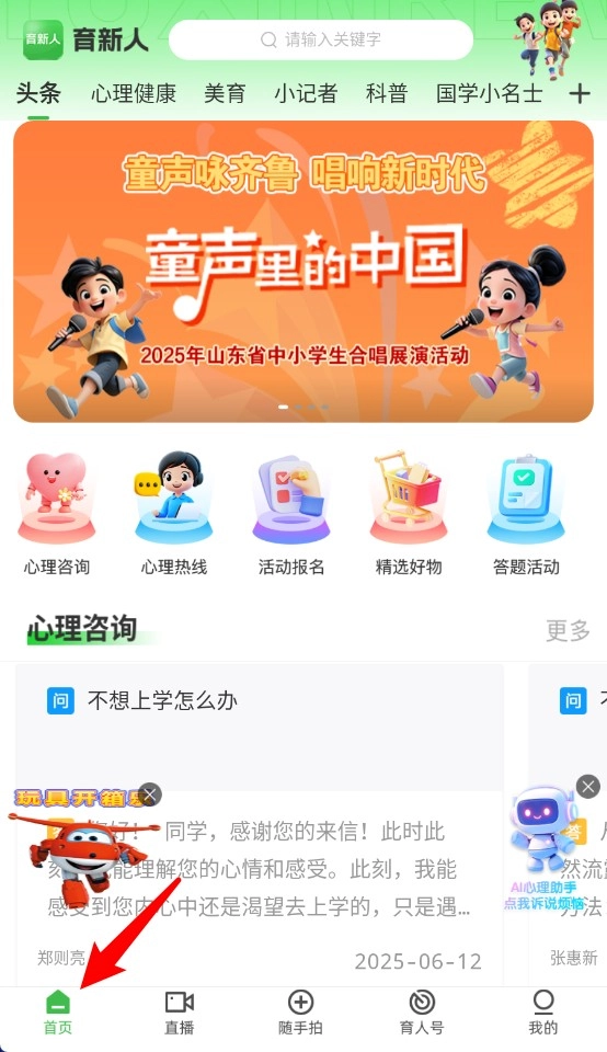 1、首页提供心理健康、育人活动、答题互动等入口,支持儿童成长内容在线浏览。