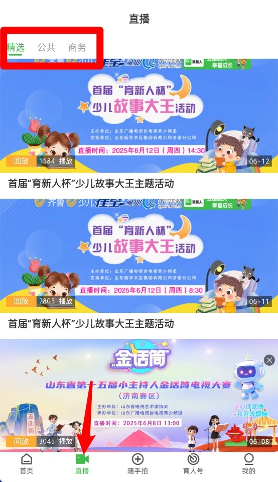 2、直播页面汇聚少儿主题活动直播内容,分类包括精选、公共及商务等多种栏目。