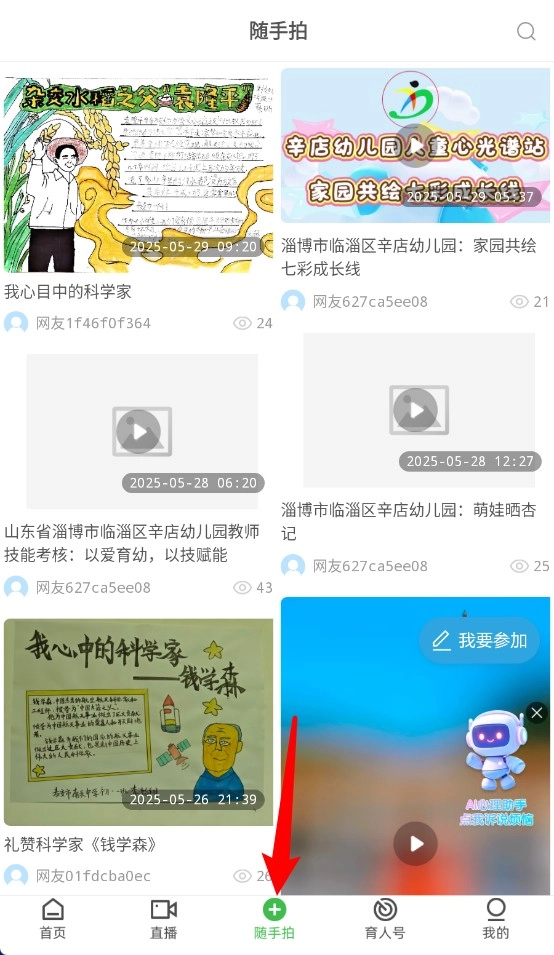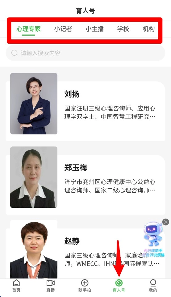 4、育人号集合心理专家、小记者、小主播、学校与机构账号,可按类别浏览内容。