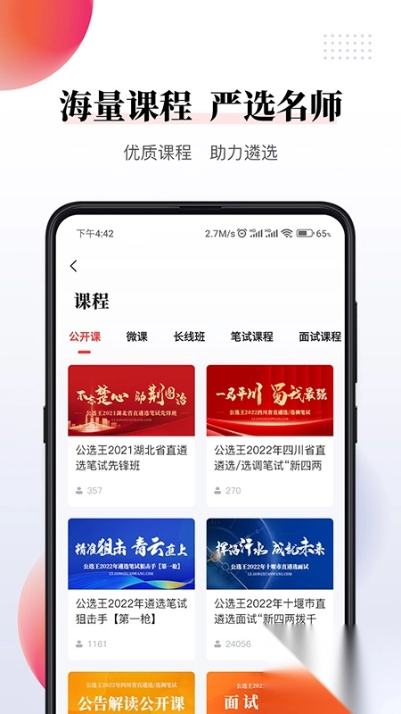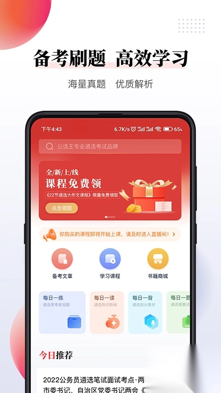 公选王app官方版专为公务员群体打造,是一款优质的线上学习软件。它涵盖历年遴选真题,提供实战模拟遴选考试,还有最新的遴选考试课程供你学习,助你轻松通过遴选考试,顺利晋升职位。有需求的朋友,赶快到本站下载吧!