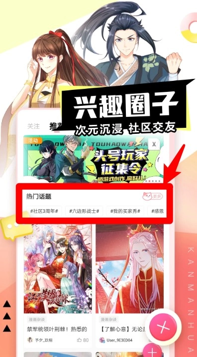 3、于“兴趣圈子”里浏览热门话题,和其他漫迷互动沟通,参与社区话题来赢取福利。
