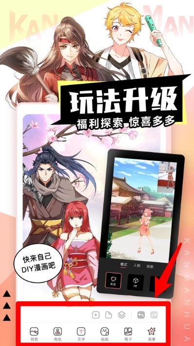4、进入底部功能区可使用DIY漫画、头像制作、文字气泡、滤镜特效等工具提升互动体验。
