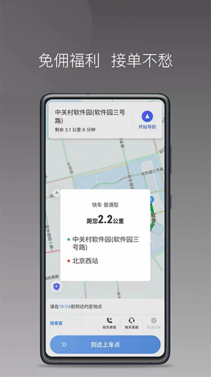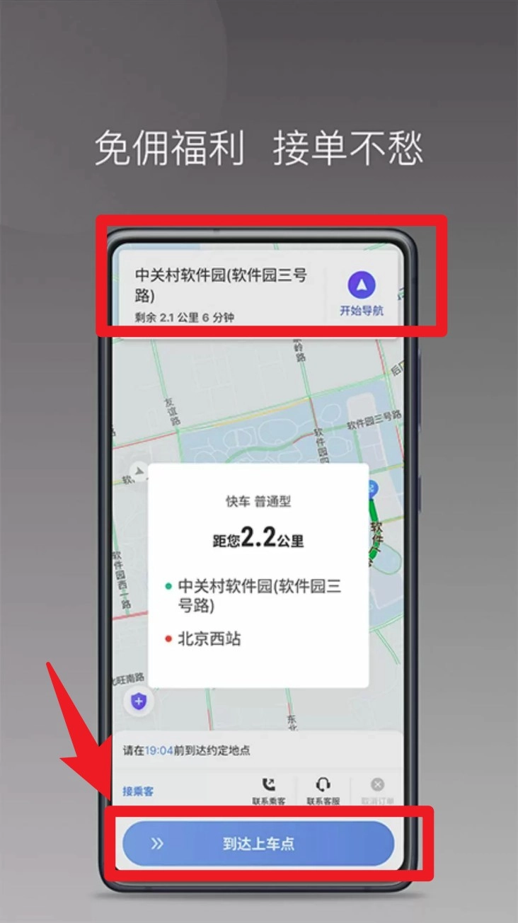 3. 成功登录后,接单界面会呈现用户的起终点以及导航路线。点击「到达上车点」即可开始出车,整个流程清晰明了,易于理解。