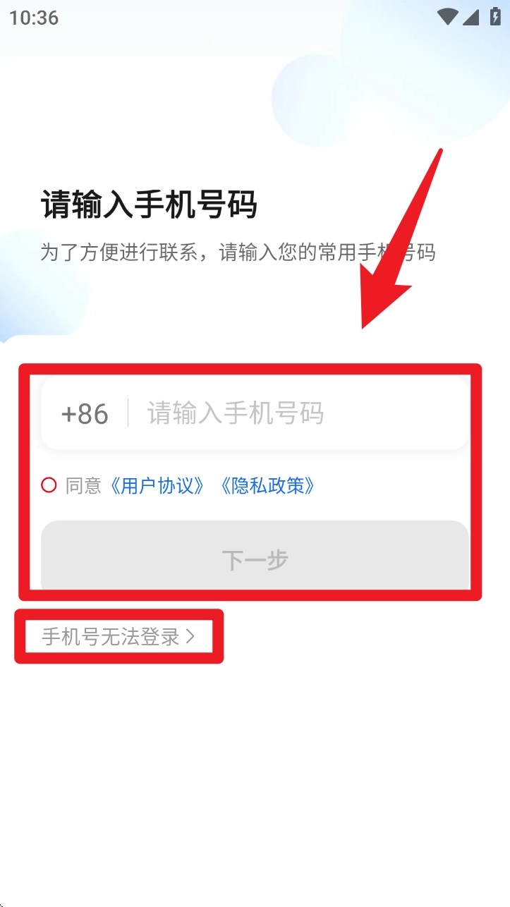 1. 进入登录页,输入手机号并勾选协议后点击「下一步」,如遇手机号失效可选择下方“手机号无法登录”。