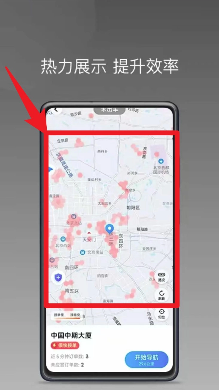 4. 通过地图热力图,能够清晰查看乘客集中的区域。热力图上高亮点的数量与需求大小成正比,即高亮点越多,表明该区域的需求越大。这一特性有助于司机迅速定位接单热点区域,高效获取订单。