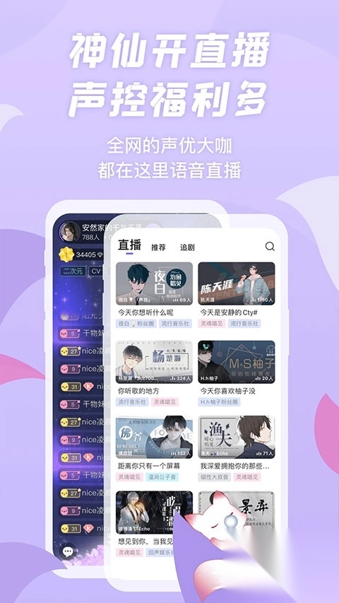 全网的声优大咖都在这里语音直播~阿杰、夏磊、吴磊、柯暮卿……这么多神仙谁顶得住!快来和他们连麦互动!还有更多暖心主播陪你聊天、哄睡、唱歌,做你的声音恋人,风里雨里,直播间等你!