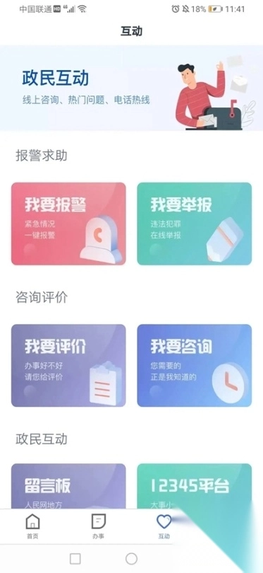冀时办APP包含“首页、办事、互动、我的”四个模块。
