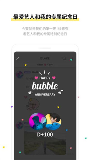 他首先会发送一条通用的欢迎消息,然后等待艺人发来信息。在此期间,你也可以发送文字消息或表情符号。上面提到的「Bubble +1」表示纪念日的天数,第一天显示为+1,第二天则显示为+2。