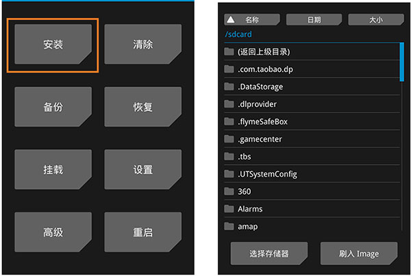2、接着,先关闭手机,然后同时按住音量上键和开机键进入recovery模式。在该模式下,点击“install”选项,随后找到supersu卡刷包并点击它。