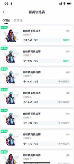 3、进入新兵训练赛后,您可以查看当前的比赛状况,我这里选择的是九点四十的巅峰精英挑战赛;