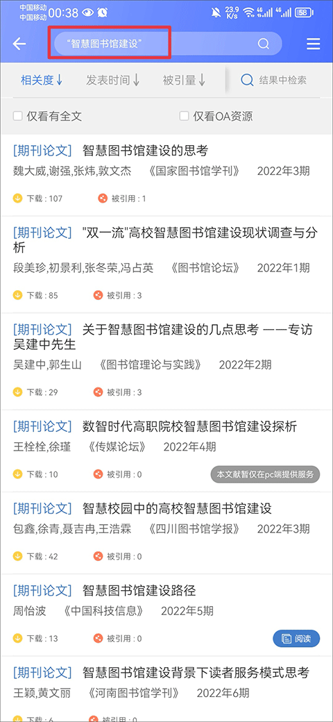 万方数据app主要为学术资讯所开发,其中整合中外文期刊、学位论文、会议文献、科技报告、专利文献、视频等十余种资源类型,内容涉及自然科学和社会科学各个专业领域,是国内最大的学术文献全文数据库之一。同时该软件还支持多种资源的统一检索,不仅可对检索结果进行排序和筛选,直接在手机端阅读文献。还可以通过对搜索类型的选择,以及选择搜文献(包括期刊论文、学位论文、专利、会议论文、科技成果、标准与法规)或搜期刊等等,能够帮助用户精准发现、获取与沉淀学术精华。