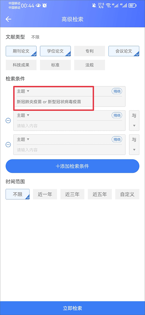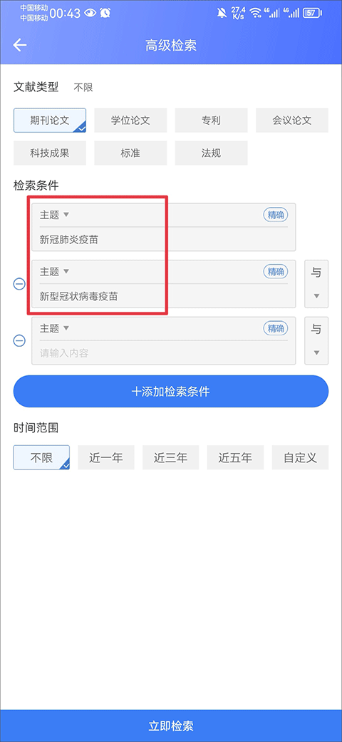 例如要查找“新冠肺炎疫苗”相关的期刊论文。首先,选择文献类型为期刊论文;然后在“主题”字段中输入(新型冠状病毒疫苗),再选择逻辑关系为(或),并输入其他相关词(新冠肺炎疫苗)等,就可以精准检索到所需要的结果。
