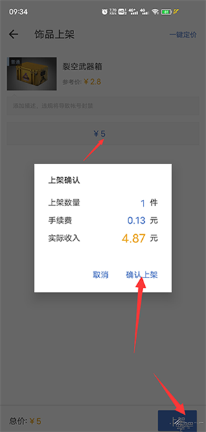 3、在商品上架界面中选择需要上架的物品,然后点击上架按钮并进行确定即可将物品上架商城。