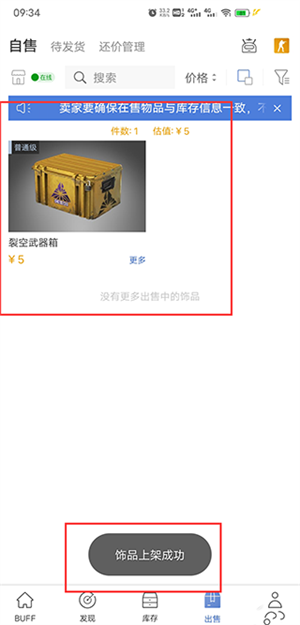 4、上架成功后,可在出售界面中看到自己上架的物品。
