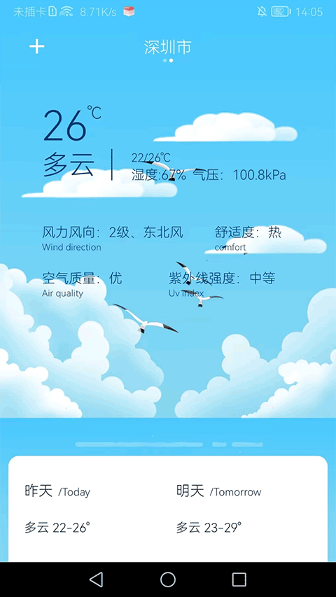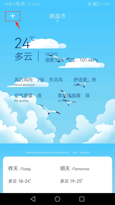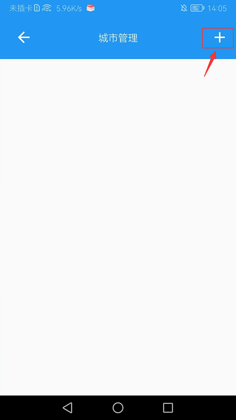 3、如果您想查看所在城市的天气情况,可以通过点击左上角的“+”来添加或管理城市。