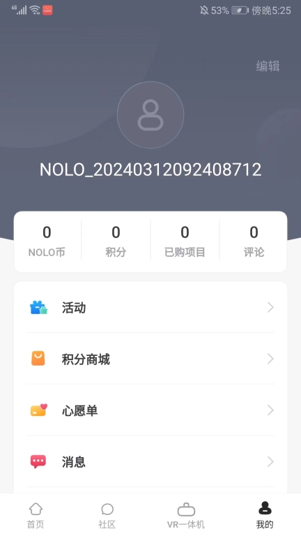 6、在我的界面中,您可以查看当前用户的NOLO币、积分以及平台活动和积分商城等相关内容。以上就是NOLO助手安卓版的使用方法。