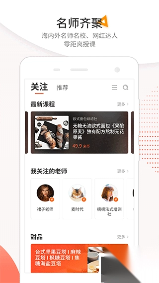 作为国内率先把职业兴趣教学和视频技术融合的平台,米熊网罗了全球一流的烹饪大师与艺术名家。像法国甜点领域的传奇人物Olivier Bajard、MOF烘焙大师Roland Del Monte、荣获法国总统授勋的Philippe,以及日本面包界泰斗小仓孝树等,数十位世界级美食权威都齐聚于此。