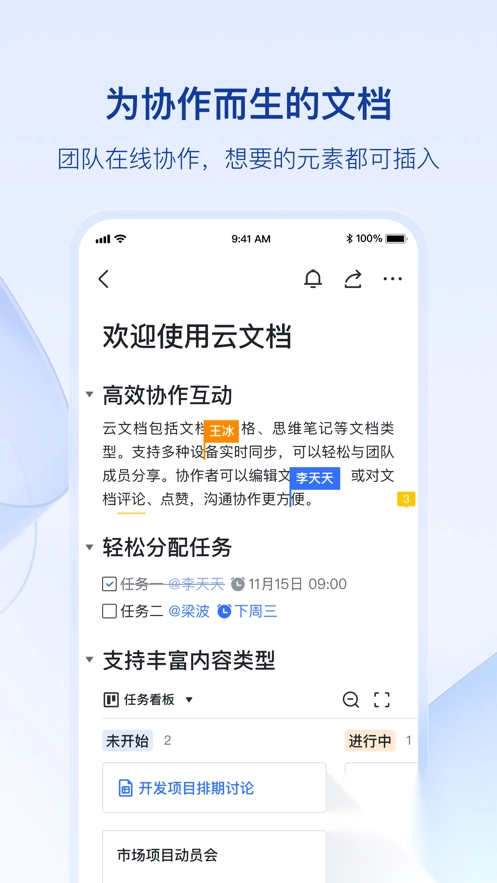 2、- 云文档:多人实时协同编辑,一切元素都可插入。不仅是在线文档,更是强大的创作和互动工具。