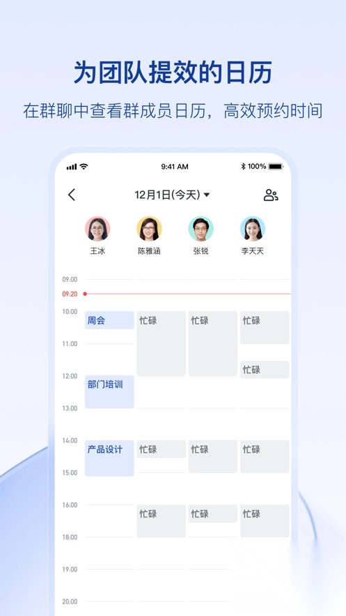3、- 日历:能便捷订阅同事日历,依据忙闲状态一键预约日程。不但可规划个人日程,团队日程安排也尽在掌控之中。