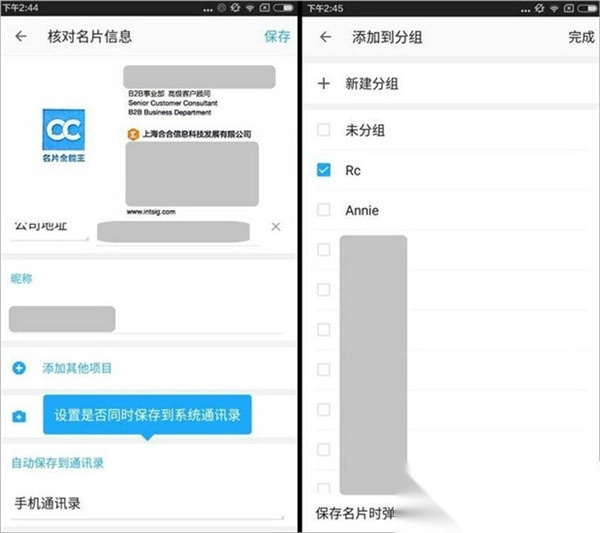 4、完成识别后,点击右上角的“保存”按钮,可以将名片在名片全能王APP内进行分组。