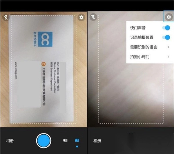 2、在主界面下方正中央,点击拍摄按钮,随后将手机横置,把摄像头对准名片。待自动对焦完成后,再次点击拍摄按钮。名片全能王会自动对照片进行剪裁,去除多余背景,增强画质,并启动对名片上文字信息的智能识别。在首次拍摄名片前,可在拍照界面右上角的设置按钮中,选择识别语言、快门声音等选项。
